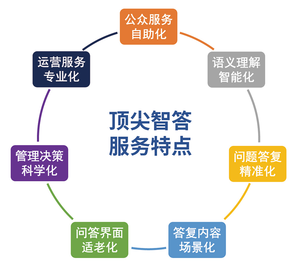 “顶尖智答”云服务,采用AI大模型、自然语言处理、知识图谱等技术,实现政府网站咨询服务自助化、实时化、智能化的“一网通答”。 对公众咨询问题的“秒回、准回、智回”,实现了“问答即服务”。顶尖智答云架构顶尖智答云特点